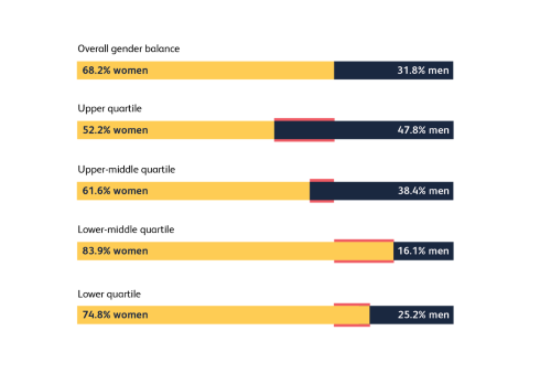 The inclusion of 82 casual workers employed on 5 April has contributed to the increase in our gender pay gap for 2024. However, even without considering them, we are disappointed that there has been no progress in reducing the gap. While we do not have an inherent equal pay issue – our compensation practices for equivalent roles remain fair – we are committed to ensuring that our overall gender balance is closely monitored. We will not lose sight of our goal to continuously review and act upon our pay gap, setting long‐term, evidence-based actions to drive improvement over time.