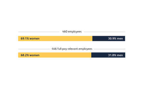 The number of full-pay relevant employees used to calculate our gender pay gap was therefore 446 staff (304 women and 142 men).